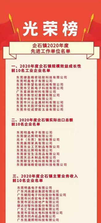3月3日上午,企石鎮(zhèn)召開2020年度工作總結(jié)大會,發(fā)布了《企石鎮(zhèn)2020年度先進(jìn)工作單位名單》,包括《2020 年度企石鎮(zhèn)規(guī)模效益成長性前10名工業(yè)企業(yè)名單》《2020 年度企石鎮(zhèn)實際出口總額前10名企業(yè)名單》《2020 年度企石鎮(zhèn)主營業(yè)務(wù)收入前10名企業(yè)名單》等10份名單。會議對2020年度企石鎮(zhèn)主營業(yè)務(wù)收入前10名企業(yè)進(jìn)行了現(xiàn)場表彰。新望公司有幸入列:企石鎮(zhèn)2020年度規(guī)模效益成長性前10名。